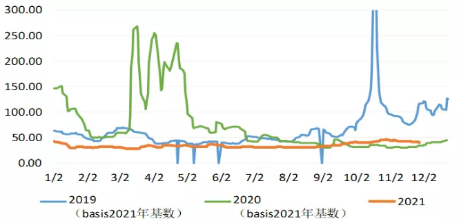 2019-2021年中东到中国TD3C航线WS走势对比图