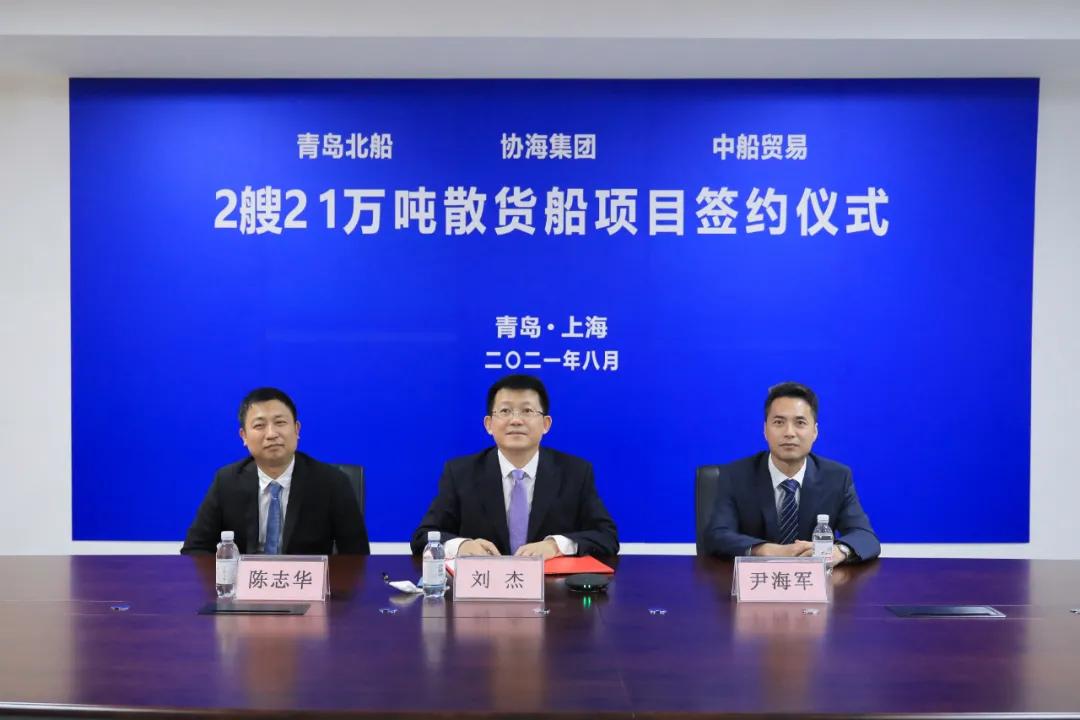云签约建造两艘21万吨散货船 2021/08/18 04:32:51 8月16日,中国船舶集团旗下中国重工子公司武船集团北船重工、中国船舶工业贸易有限公司与浙江协海集团有限公司在中国上海、青岛两地通过视频连线方式举行了两艘21万吨散货船项目云签约仪式