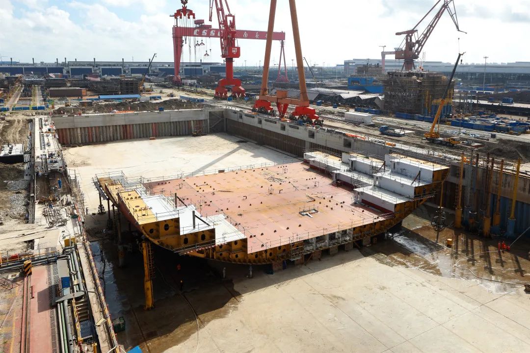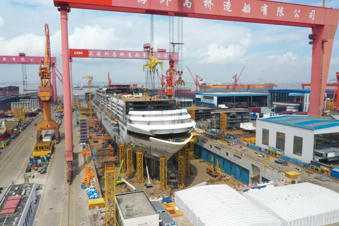 国产首制大型邮轮完成首个艏部总段吊装 2021/08/12 08:27:03 国产首制大型邮轮完成首个艏部总段吊装! 预计9月实现全船结构贯通。