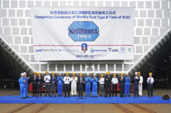 世界首制突破关键技术! 2021/05/14 11:56:19 5月12日,中国船舶集团旗下江南造船举行了世界首制99000立方米超大型液化乙烷运输船 (VLEC) 首个B型液货舱完工仪式,标志江南造船99000立方米VLEC建造实现关键技术突破,其自主研发的“BrilliancE®”货物围护系统实现工程化和节拍化生产