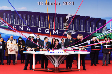 第6艘“绿巨人”交付! 2021/03/19 09:32:34 2017年9月,中国船舶集团与法国达飞集团签订9艘23000TEU超大型双燃料集装箱船建造合同。2020年9月,全球首艘23000TEU超大型双燃料动力集装箱船“达飞雅克•萨德”号