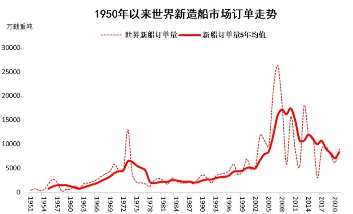新世纪初,全球海运量约65亿吨,对应的新船成交量约5000万载重吨;当前,世界海运量已经达到120亿吨,正常情况下这一体量对应的新船成交量在9000万载重吨左右。