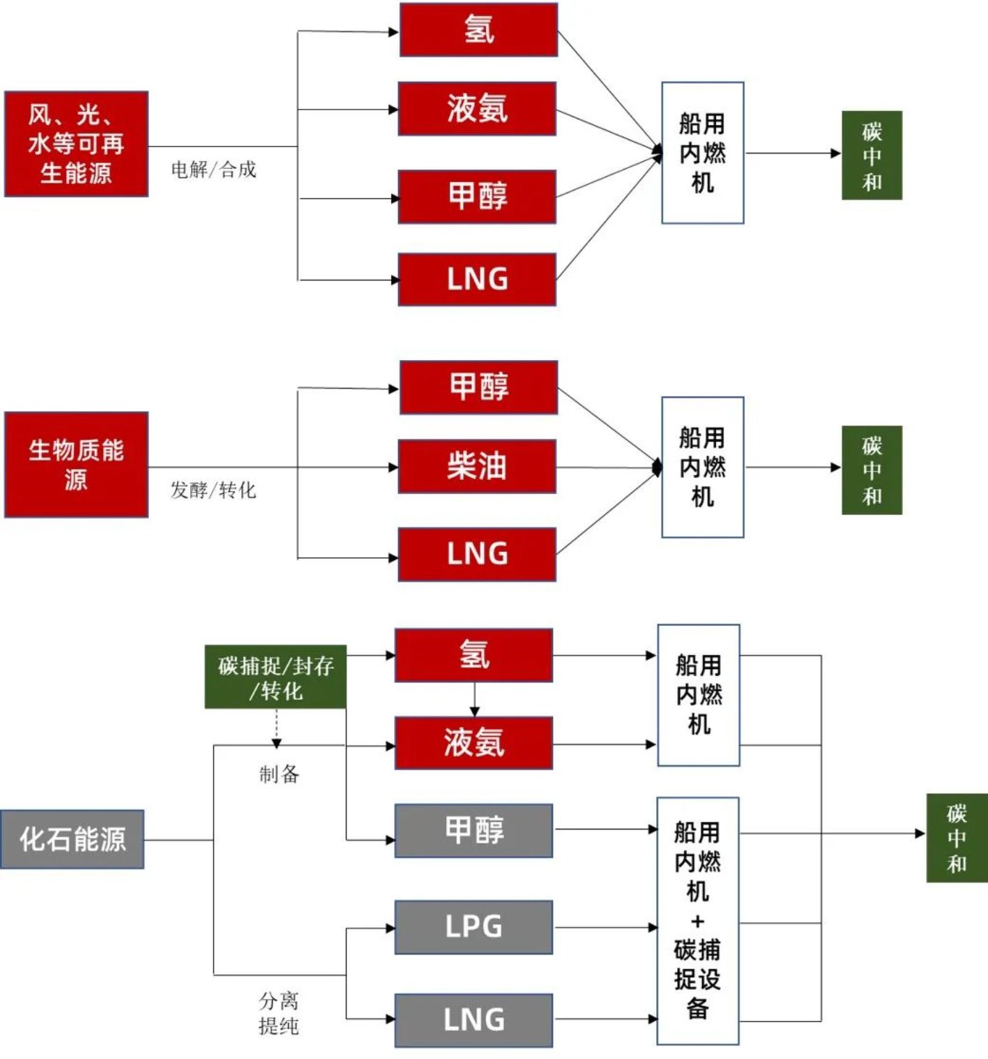 当前国际社会推进气候治理的核心目标是实现碳中和,而不是消灭化石能源或其它哪一种能源。目前船舶工业探索的主要船用燃料中,无论是氢、氨、LNG、LPG还是甲醇,都可以在能源转化或使用过程中实现碳中和。