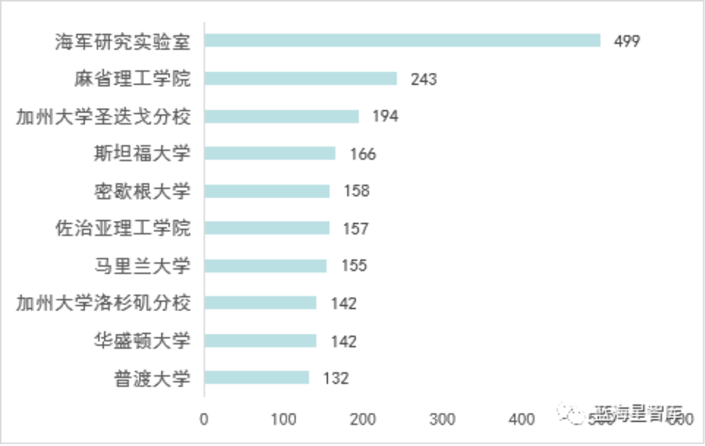 2020年,美国海军资助发表论文5390篇,成果数量最多的科研机构依次为海军研究实验室、麻省理工学院、加州大学圣迭戈分校等。