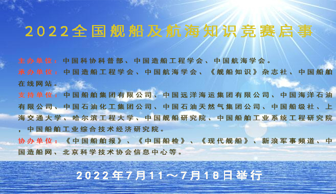 2022全国舰船及航海知识竞赛启事 2022/07/07 10:58:00 为全面落实国家《科学素质纲要》,庆祝“中国航海日”,培养广大青少年热爱祖国、热爱科学、热爱海洋、热爱舰船的情操,树立国防意识、海洋意识,普及舰船、航海和海洋等方面的知识,为相关行业培养人才